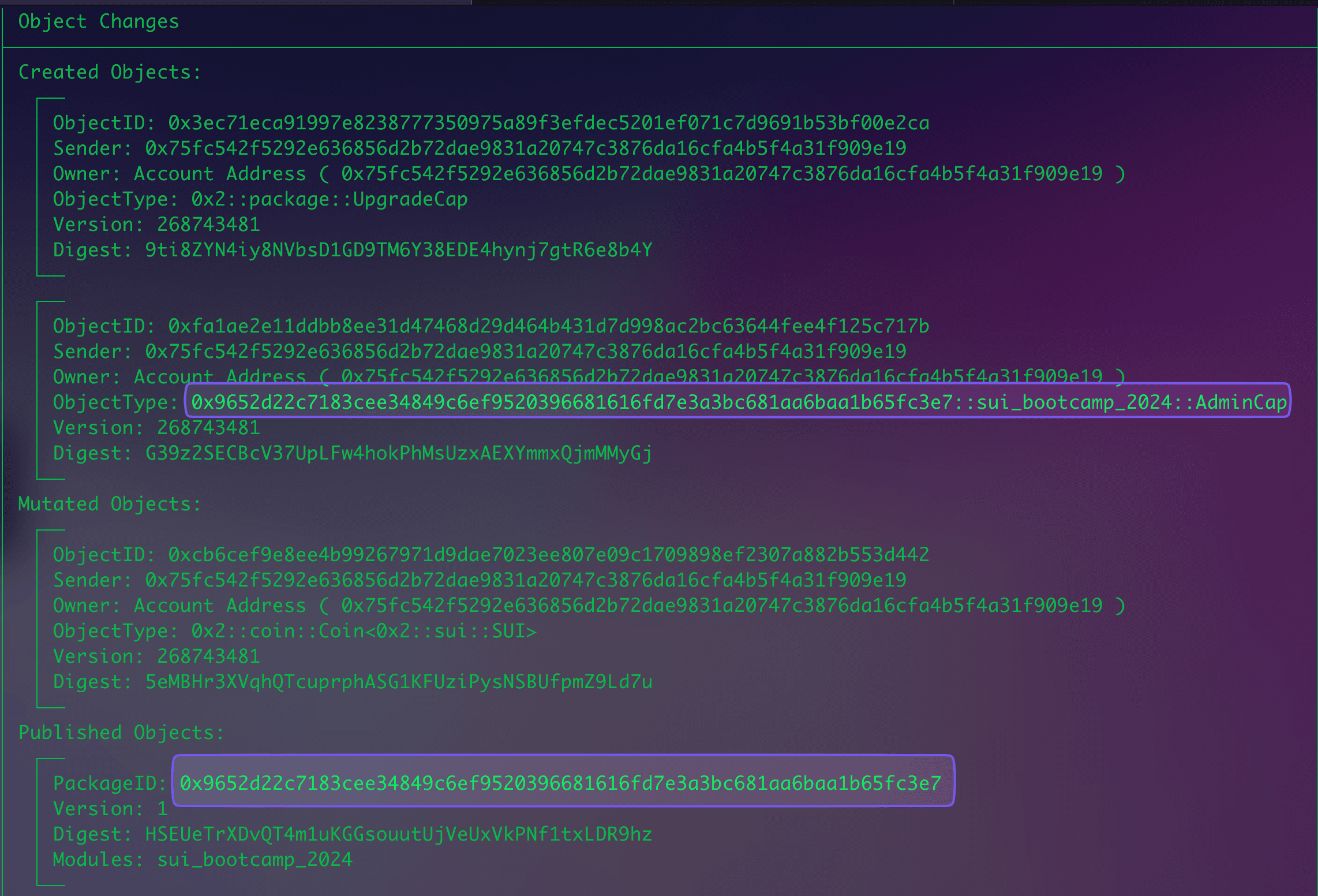 │ │ ObjectType: 0x9652d22c7183cee34849c6ef9520396681616fd7e3a3bc681aa6baa1b65fc3e7::sui_bootcamp_2024::AdminCap │